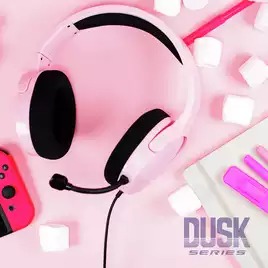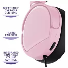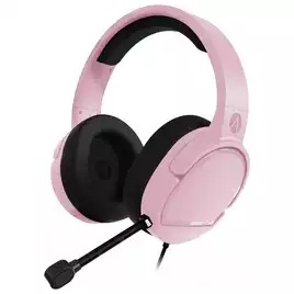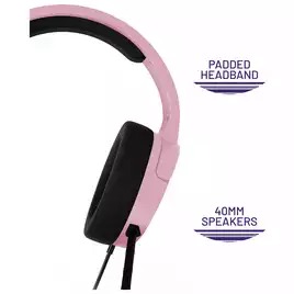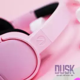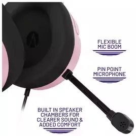 3.5mm jack, volume control and mute functionality. Matte finish in pastel pink with gloss accents.